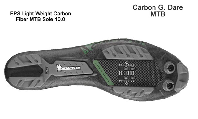 EPS Light Weight Carbon Fiber MTB Sole 10.0: The sole was developed in collaboration with Michelin®, and features a carbon structure ensuring excellent stiffness and lightness for powerful pedaling. The Michelin® rubber tread ensures maximum abrasion resistance and excels even in extreme conditions, while the profile design offers exceptional grip and traction. Spacing between treads facilitates effective self-cleaning and rapid mud shedding. With a rigidity index of 10, this sole stands as the stiffest in the Gaerne MTB range