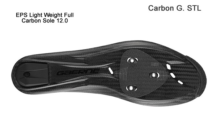 Sole: The Gaerne Eps Lightweight Full Carbon Sole 12.0 is ultra light and ultra thin. The optimized carbon fiber weave ensures every watt of power is transferred to the pedals. The stability of the foot is increased thanks to the shape of the sole in the plantar arch area. Four air vents guarantee ventilation inside the shoe. The sole has an anti-slip insert in the toe and an interchangeable pad in the rear. Cleat position options have been increased by 9mm compared to the previous sole, and an alignment scale printed on the sole allows you to memorize the position of the cleat. Outstanding stiffness index of 12.