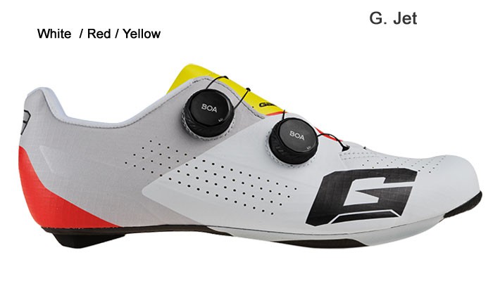 Introducing the G.JET, the latest advancement in our high-performance cycling footwear range. Developed through extensive research at our R&D department and in collaboration with world-class athletes, the G.JET represents the perfect balance of innovation, style, and performance, ready to take on any challenge on the road. The upper features G.Frametex technology, combining fabric and polyurethane with a supportive frame that enhances structure and ensures a lightweight feel. Strategically perforated for breathability, it optimizes air ventilation to keep your feet cool and dry throughout your ride